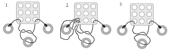 Partea de sfoara aflata in stanga inelului din mijloc si care se continua pana la inelul din dreapta, va fi trecuta prin orificiul prin care este trecuta si sfoara care este legata de inelul din stanga. Aceasta bucata de sfoara va forma un arc de bucla suficient de larg incat sa poata fi trecuta "pe deasupra" inelului din stanga. Apoi aceasta bucata se va retrage din orificiu "pe dedesubtul" inelului din stanga